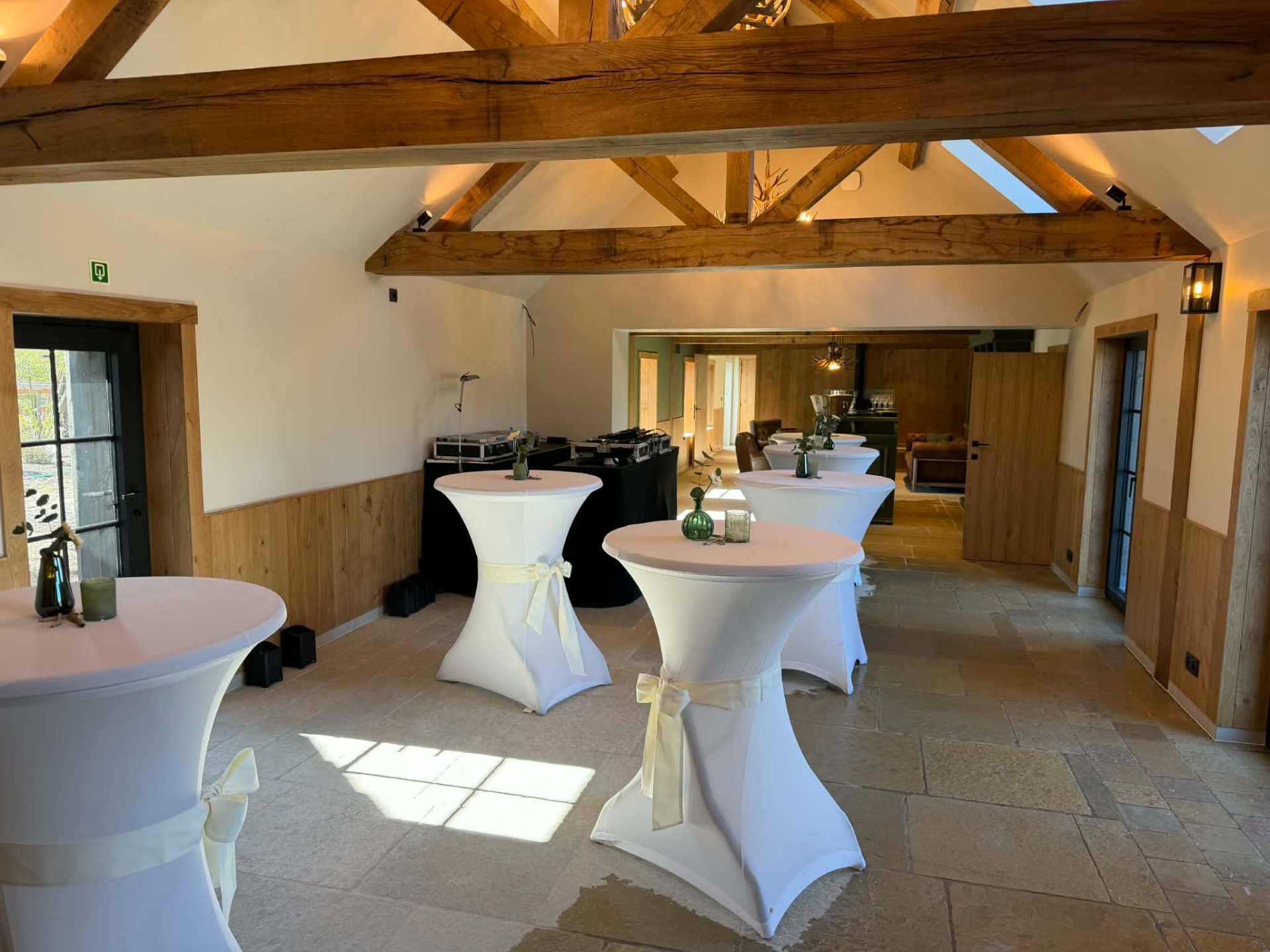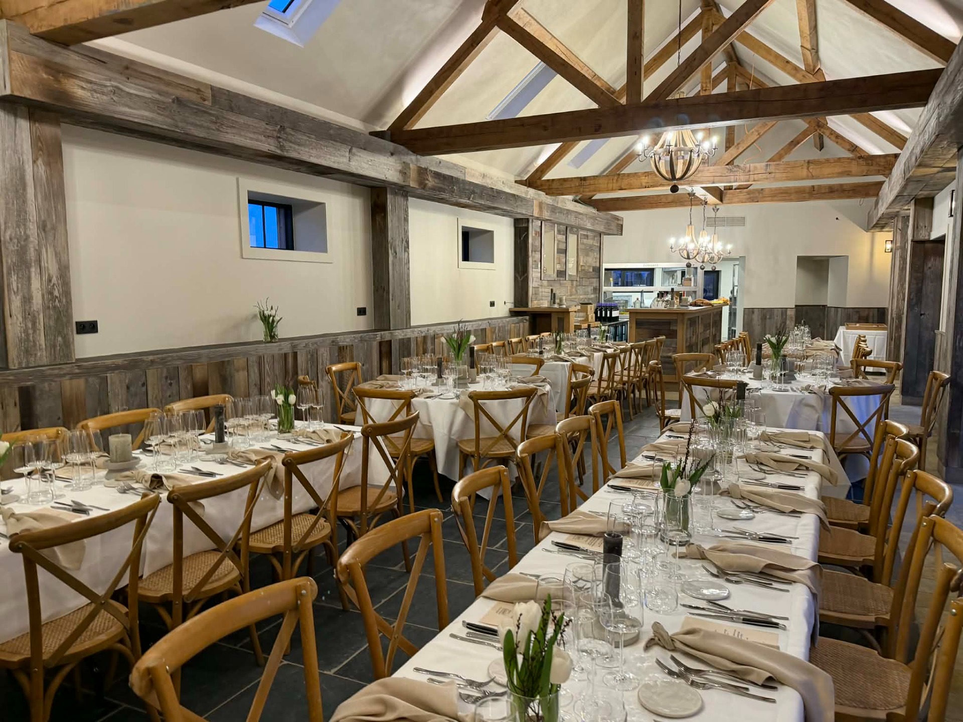 De zaal straalt een warme, authentieke sfeer uit dankzij het gebruik van gerecupereerd hout afkomstig van 100 jaar oude Ierse stallen.